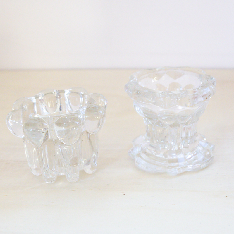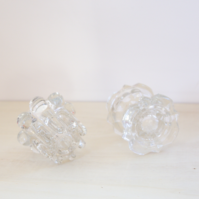 2 bougeoirs en verre transparent, de 2 formes différentes datant des années 60. Les 2 bougeoirs sont marqués Reims, France.