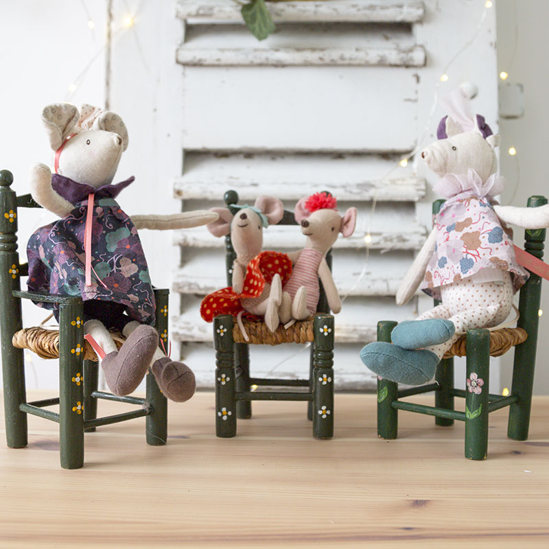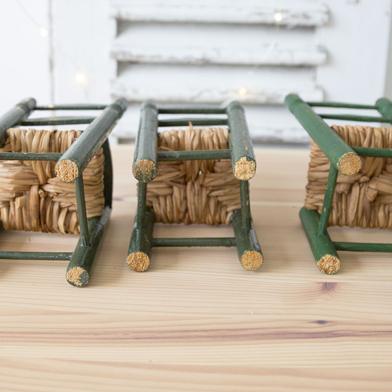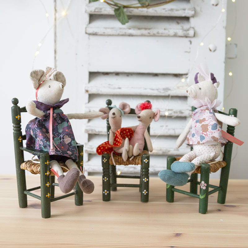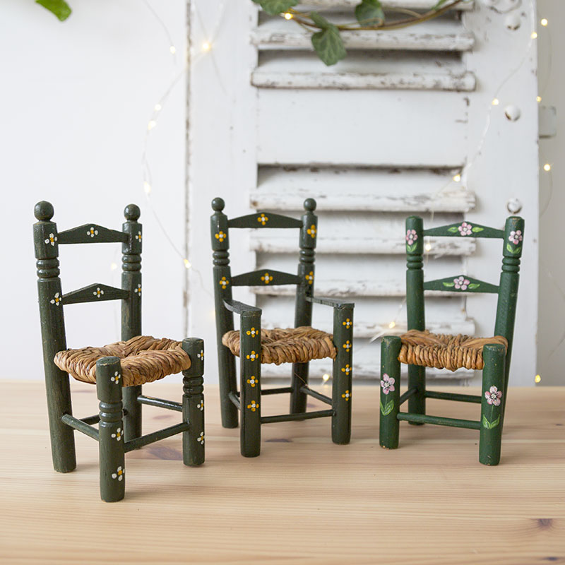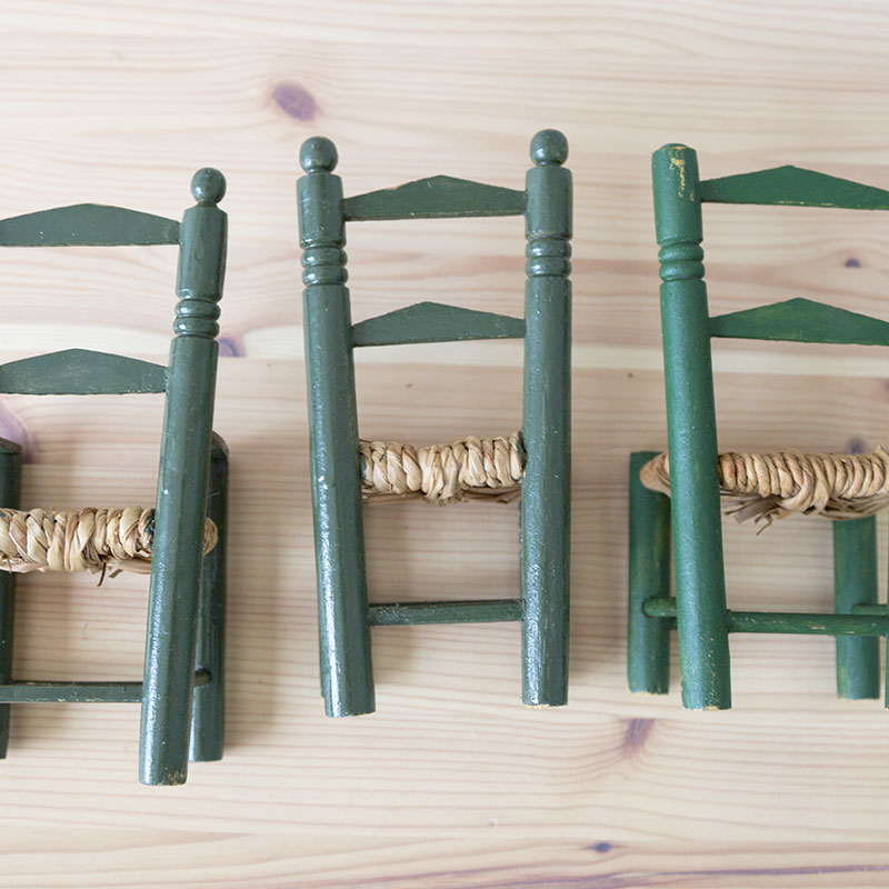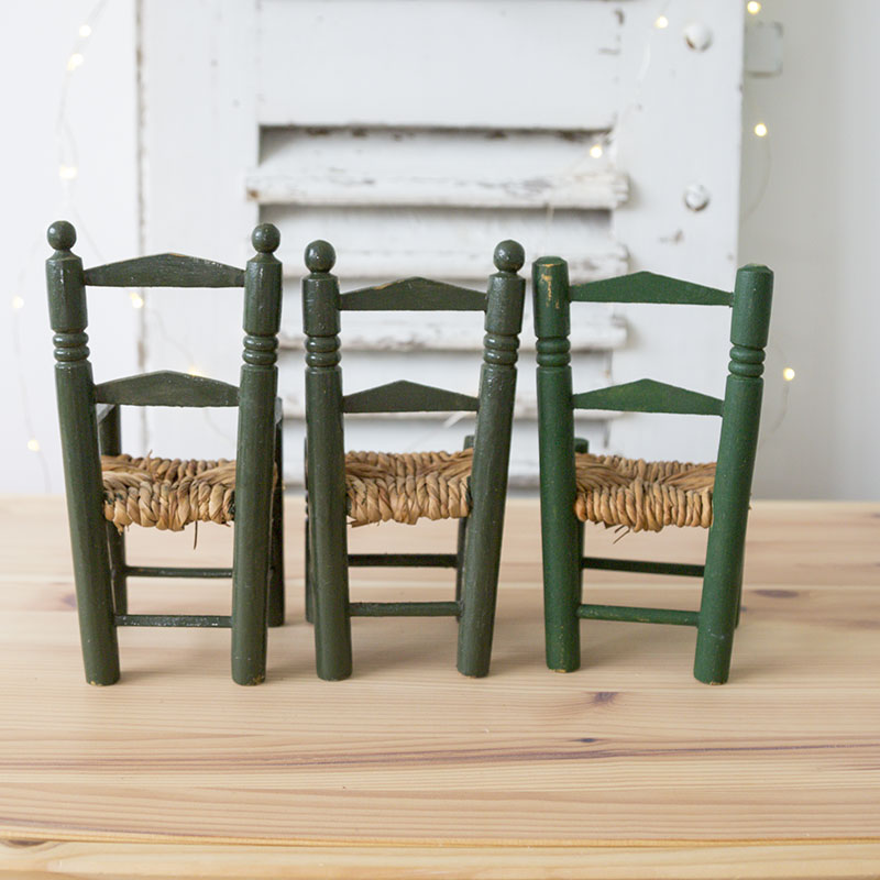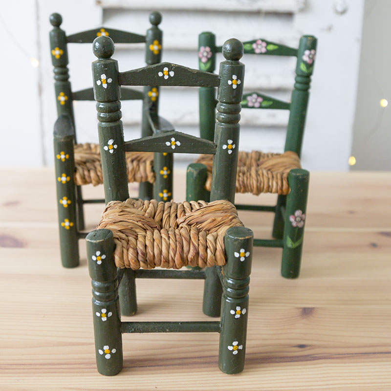 Petit set de 3 assises vintage pour poupées ou doudous. Il se compose de 2 chaises et un fauteuil de couleur verte avec des motifs de fleurs peint à la main. Le tout est en parfait état.