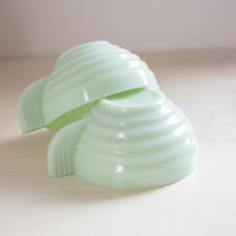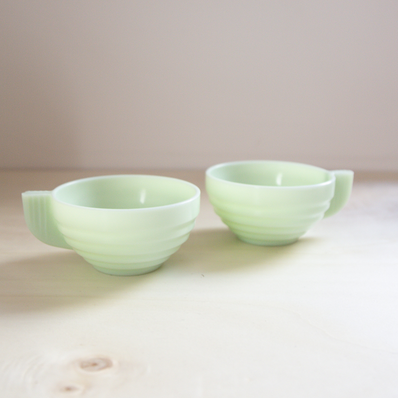 2 jolies tasses en opaline vert d’eau, créées dans les années 40 à 50, dans un style art déco et fabriquées en France.