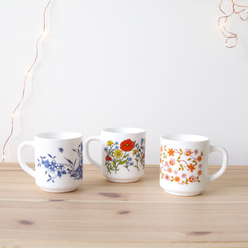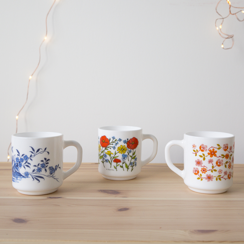 3 mugs Arcopal de Luminarc à décor floral différents, . L’un des mugs est signé sur le dessin R.Carman.