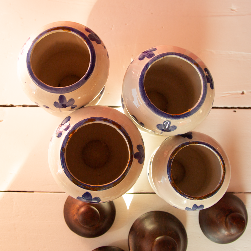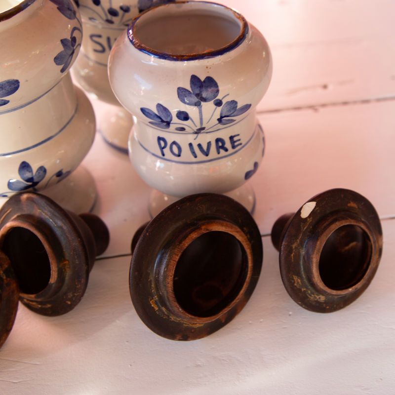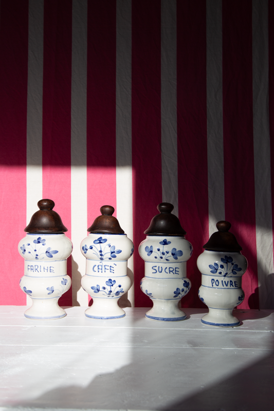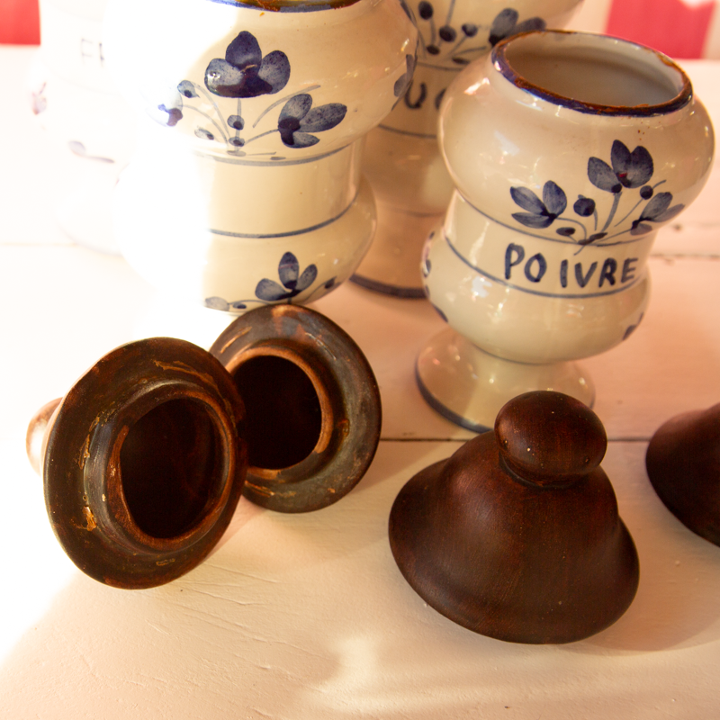 4 pots à épices en céramique, de forme cylindrique : farine, sucre, café et poivre. le couvercle est lui-même en céramique, peint.