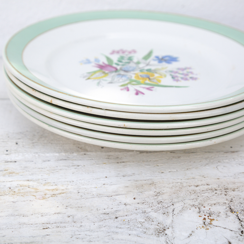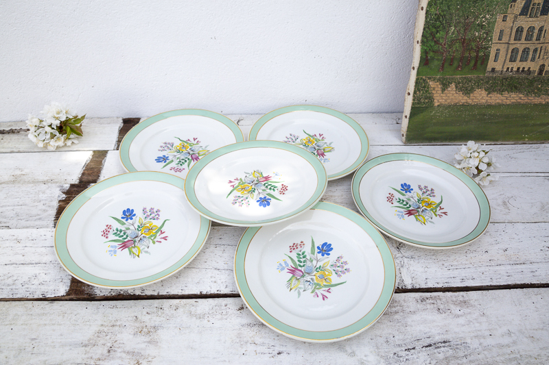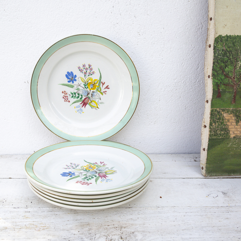 6 assiettes plates provenant de la faïencerie de Badonviller. C’est un modèle avec un motif central de fleurs et un bandeau de couleur mint sur le pourtour de l’assiette avec un liseré doré.