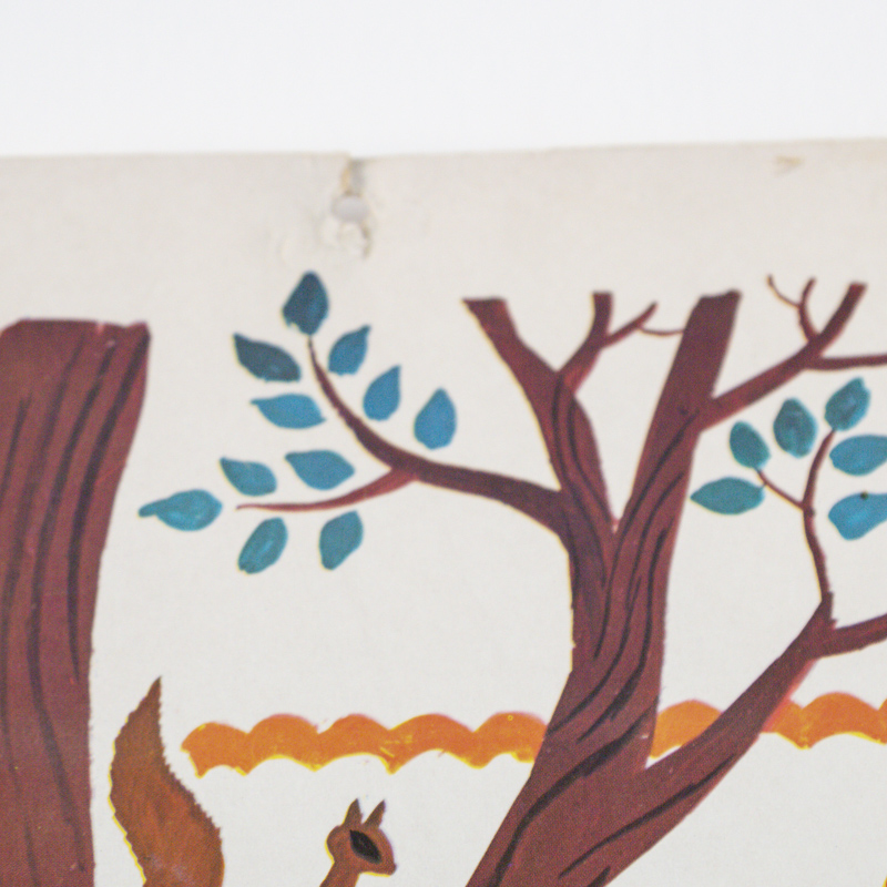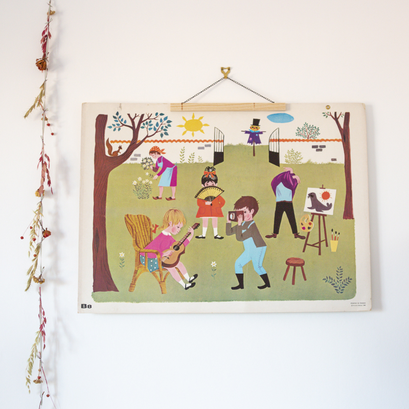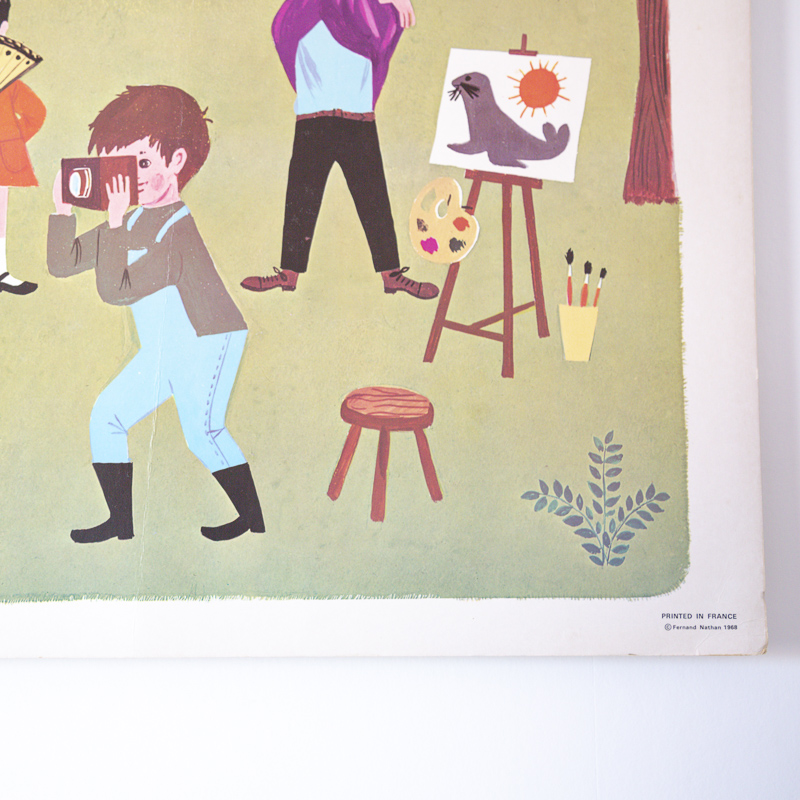 Affiche scolaire des éditions Nathan datant de 1968. Illustration recto seulement par Nina Morel, intitulée « B8: Daniel et Valérie – Au jardin ».