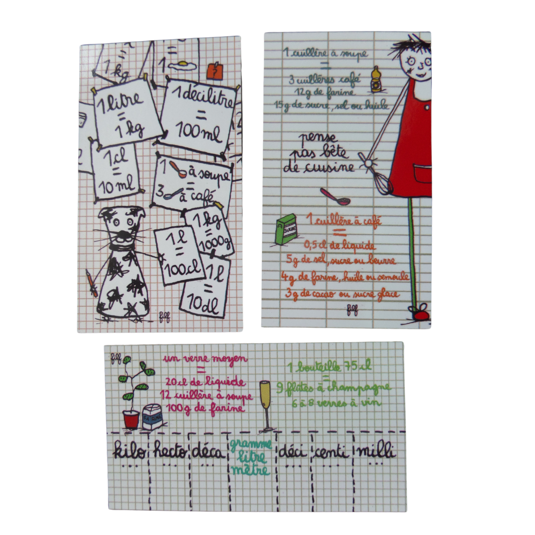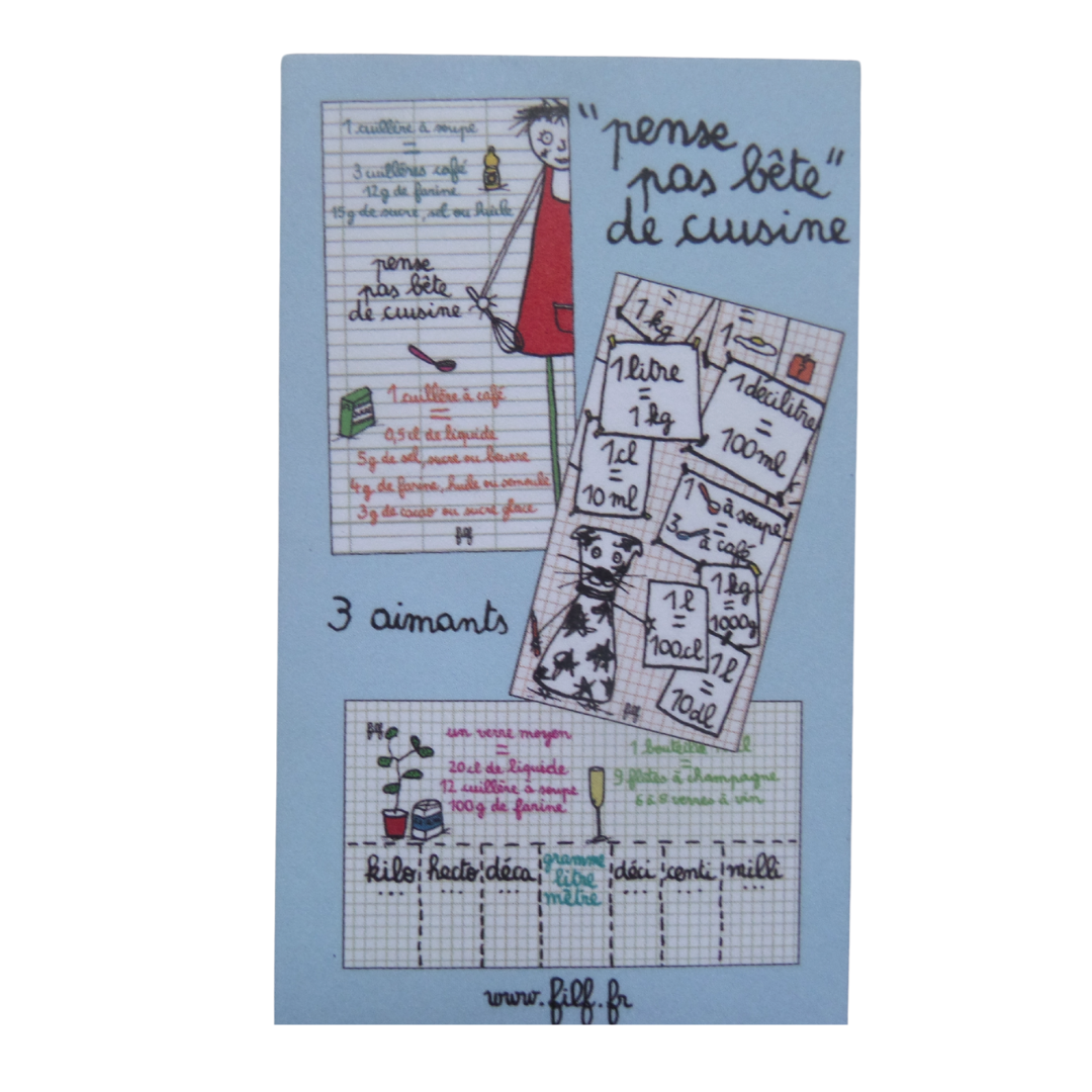 Aimant 2 : Les conversions de poids : Pour nombreux d’entre nous cela relève d’un véritable casse tête. Cet aimant vous aide à passer de kilogrammes en grammes en un clin d’œil. Besoin de savoir combien de grammes font 0,5 kg ? Pas de problème, cet aimant vous aidera en un clin d’oeil à faire la convertion