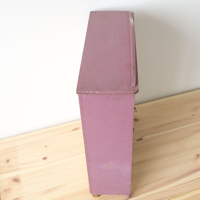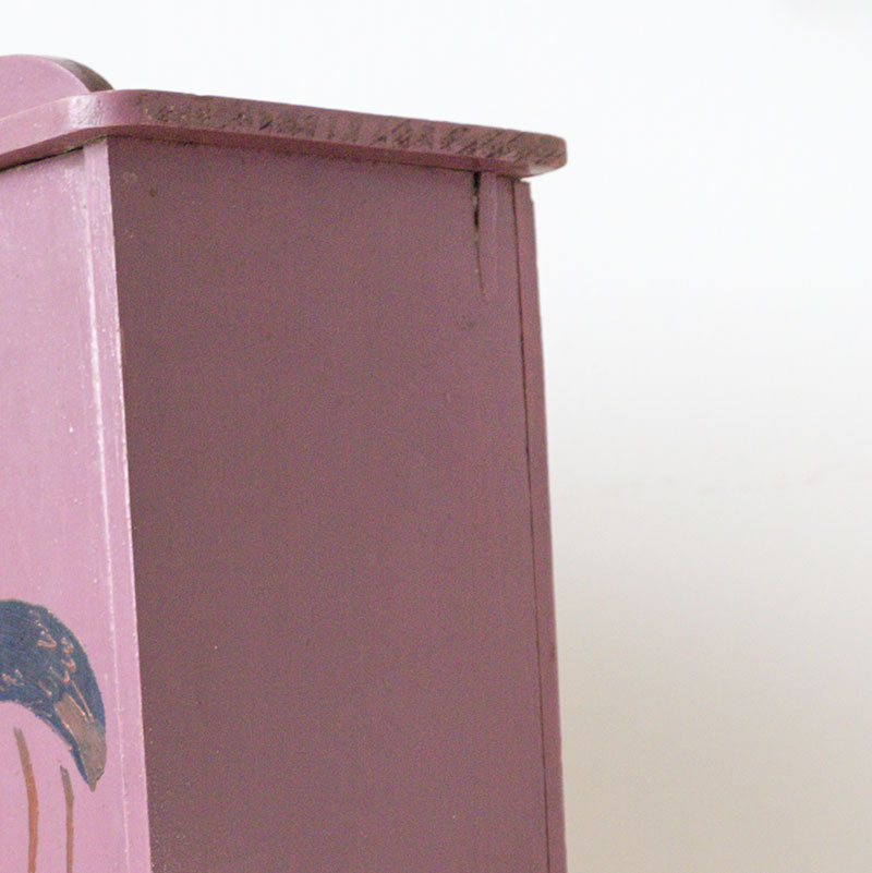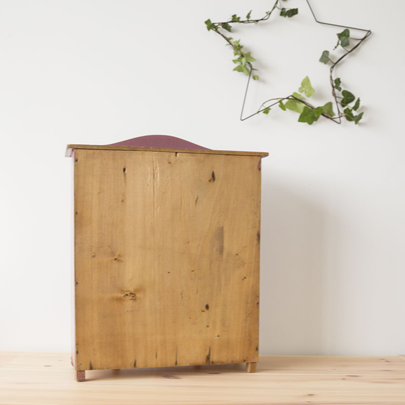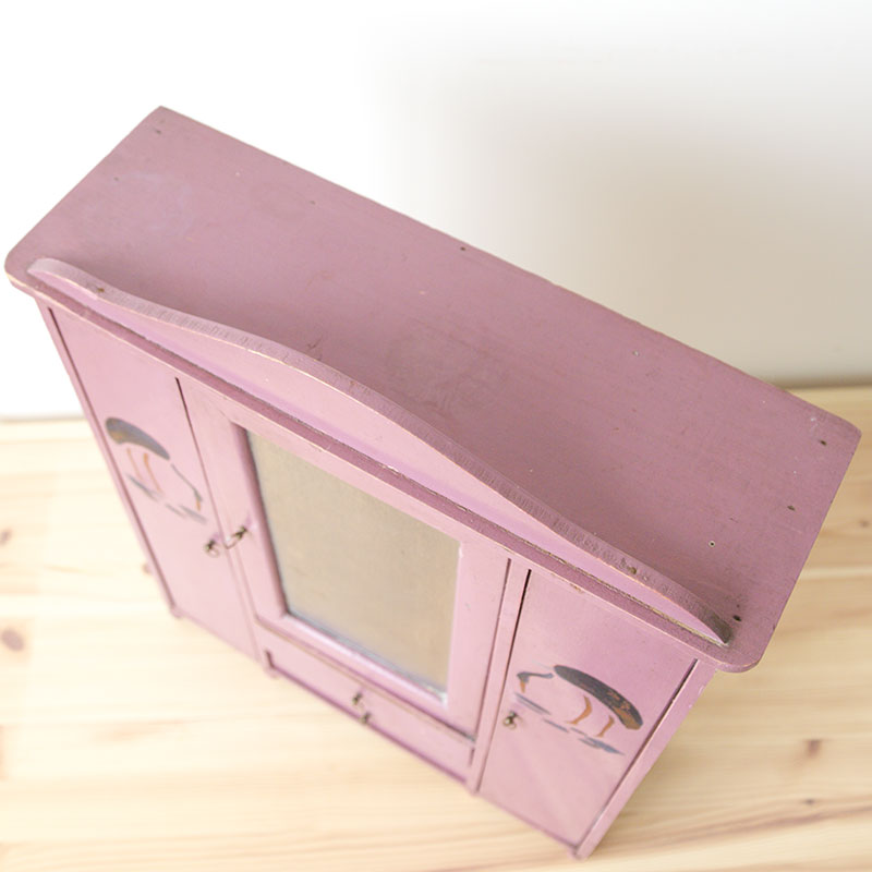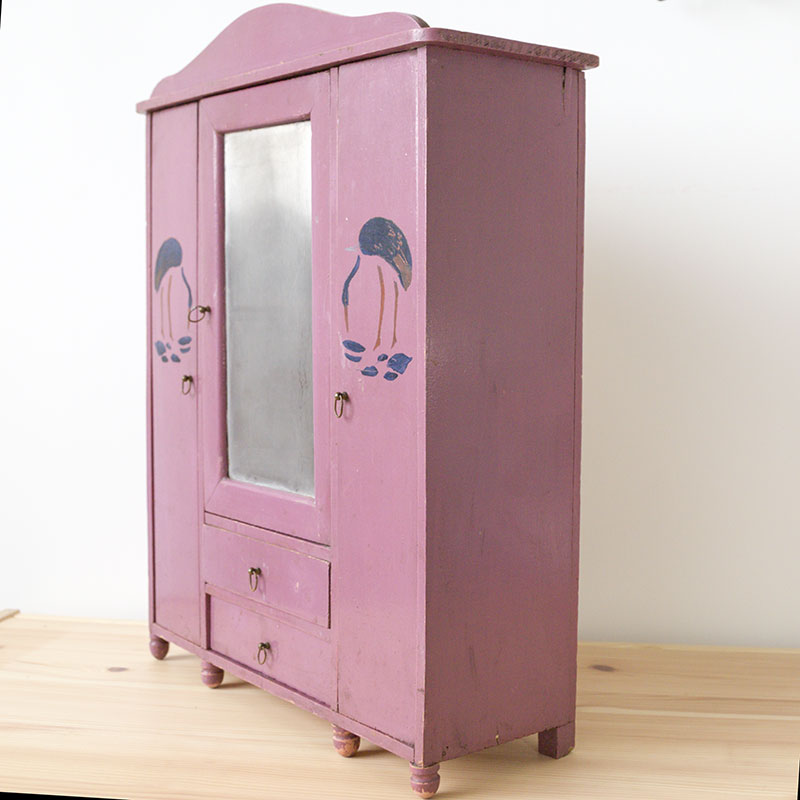 Armoire de couleur prune avec motifs d’oiseaux pour poupée, peluches ou petits personnages. Ses poignées sont en métal. L’armoire est en très bon état, elle possède quelques signes du temps qui passe.