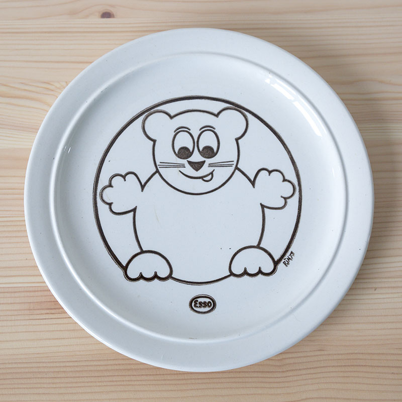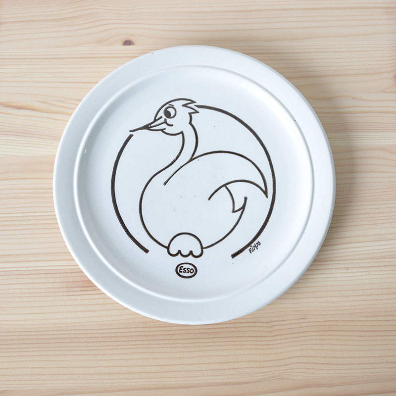 4 assiettes à dessert publicitaire de la marque Esso. Elles sont en céramique, signées PJM et datent de 1975.