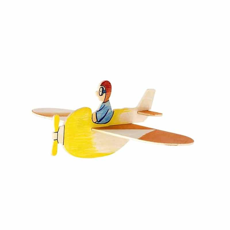 Un avion au look rétro avec un pilote très sérieux aux commandes. Avion en bois blanc à décorer avec crayons, feutres, peinture… avant de l’assembler sans colle. Une ficelle est prévue pour le suspendre.