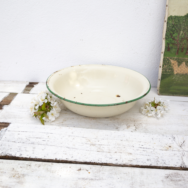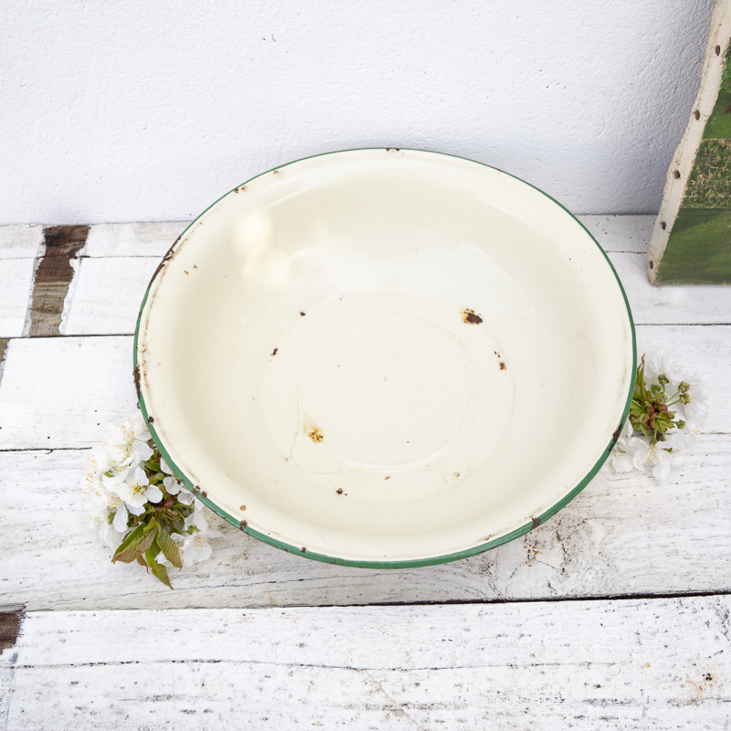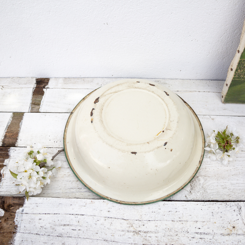 Bassine en émail de couleur blanc crème. Elle possède un liseré vert.