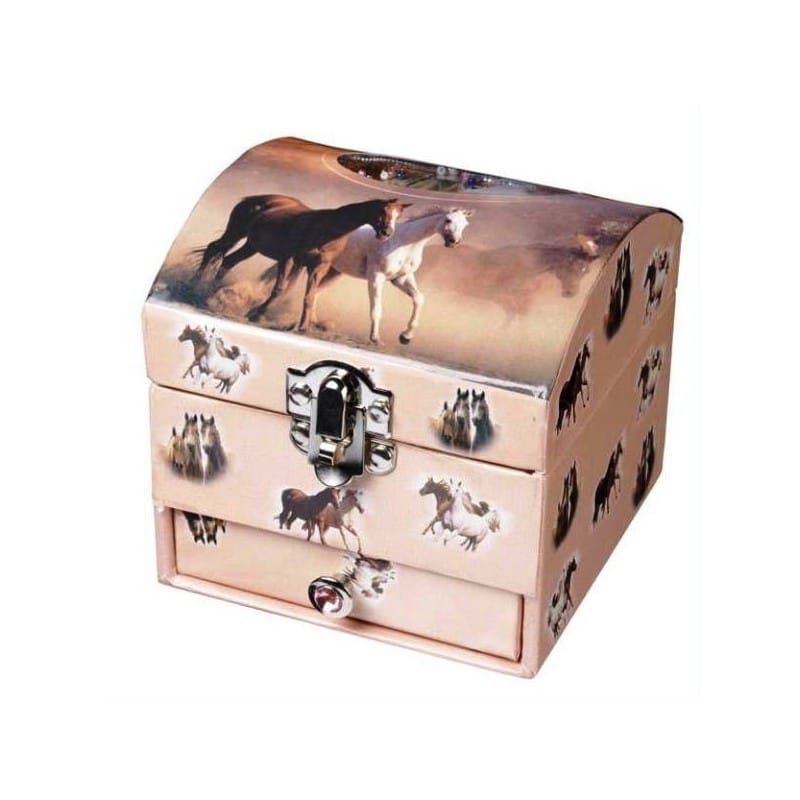 Boîte Amis des chevaux avec couvercle et tiroir aux couleurs discrètes que l’on pourra poser sur une table de chevet ou un bureau. Une idée de cadeau pour les enfants qui aiment les bijoux ou collectionner de petits trésors.