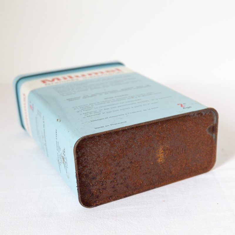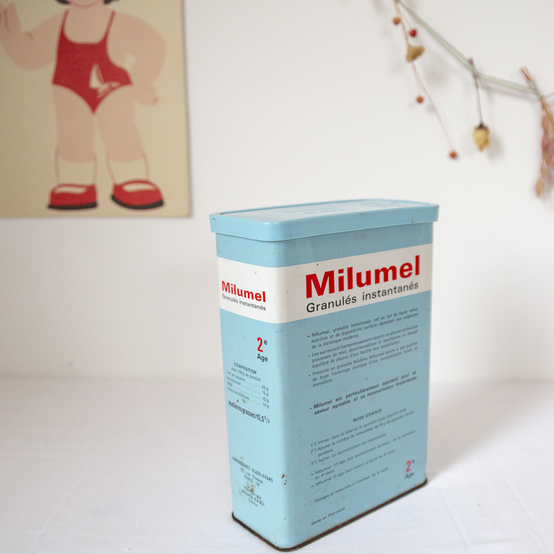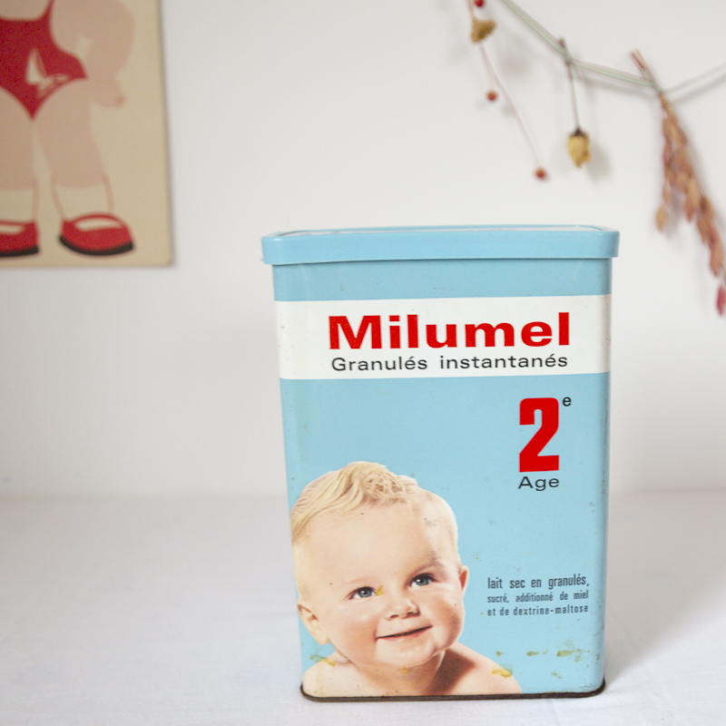 Boite en fer vintage de lait en poudre pour bébé 2e âge de la marque « Milumel ».