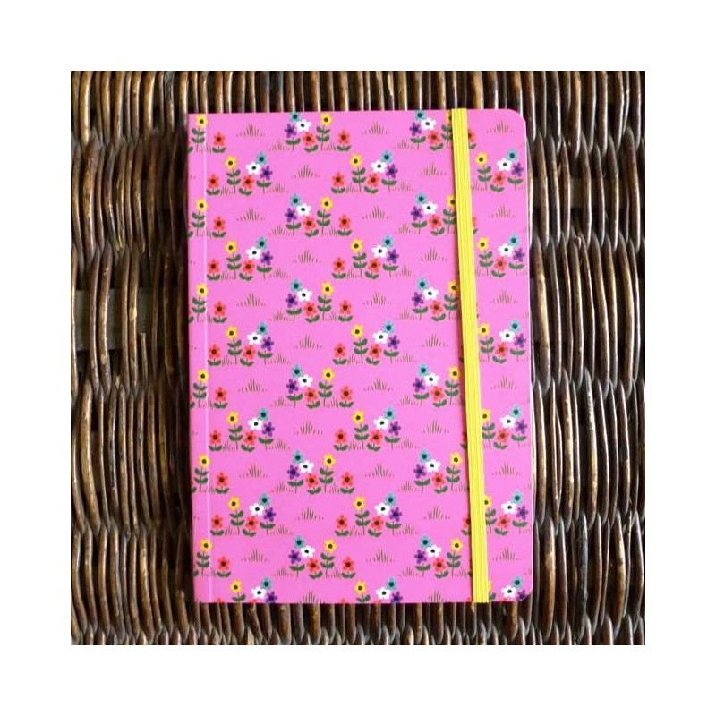 Des petites fleurettes sur une couverture cartonnée rose avec un élastique jaune tournesol. Pour une belle écriture, pages avec lignes.