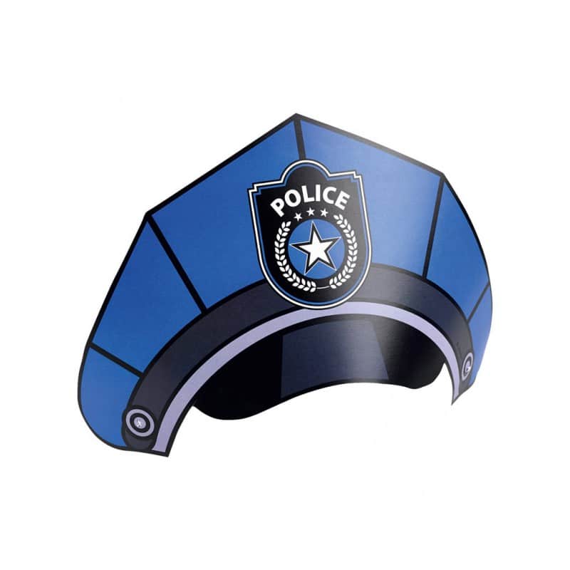 Casquettes en carton avec élastique pour tous les petits policiers qui mèneront l’enquête. Paquet de 8 chapeaux de fête bleus avec l’écusson police pour les petits invités d’une fête d’anniversair.