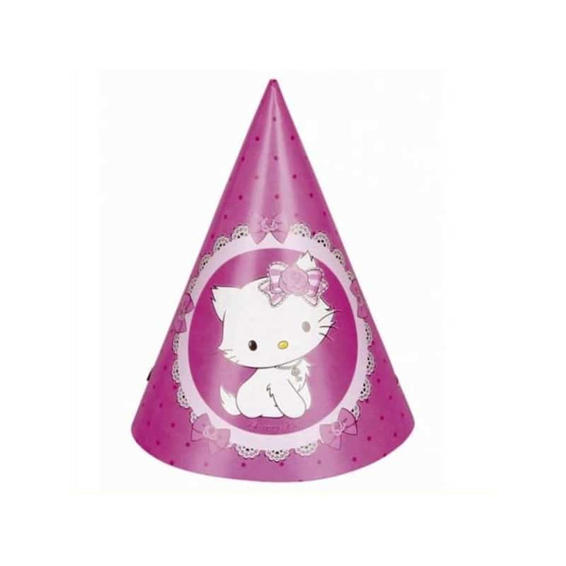 Paquet de 6 chapeaux Charmmy Kitty pour se déguiser à l’occasion de la fête d’anniversaire d’une petite fille. Cône en carton rose avec élastique blanc.