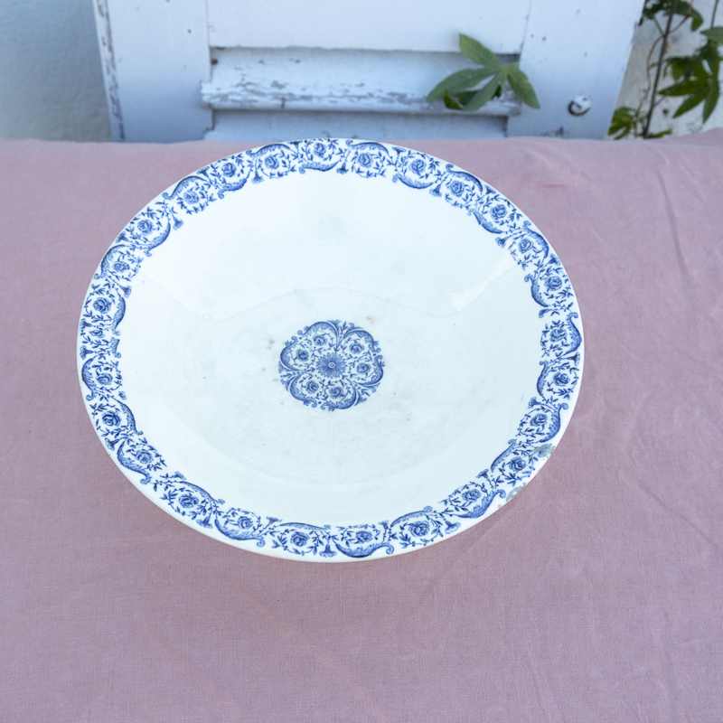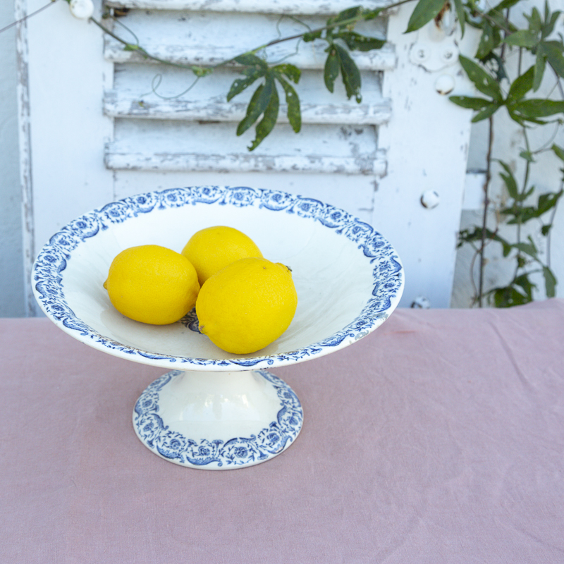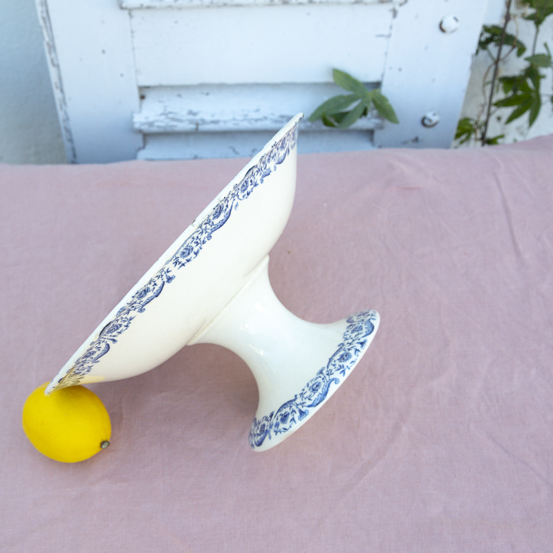 Compotier en porcelaine opaque de la faïencerie de Gien. Il s’agit du modèle Biarritz avec des motifs floraux de couleur bleue.