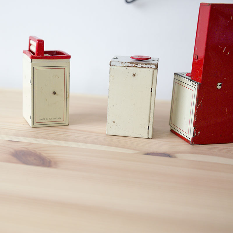 Cuisine miniature en métal composée d’une machine, d’un frigo, d’un vaisselier et d’un placard à balai. Le vaisselier et le placard à balai contiennent des petits objets en plastique.