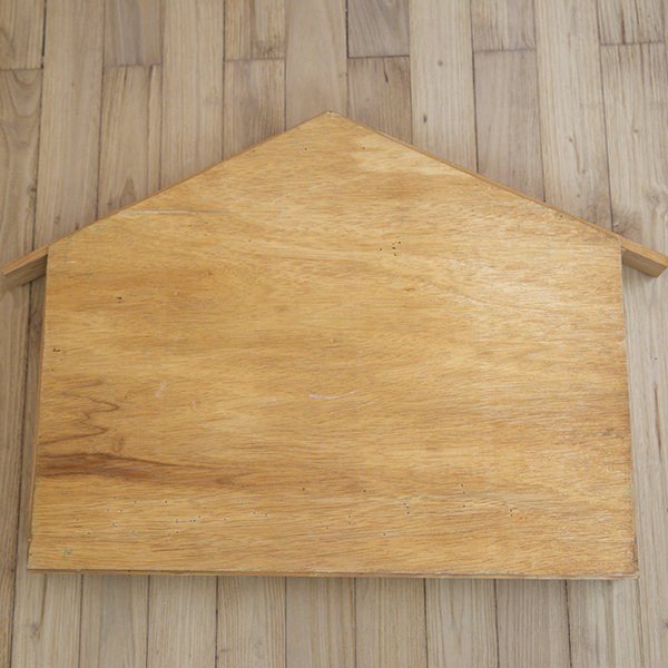 Cadre en bois en forme de maison avec petites étagères pour un style casier d’imprimeur ou cabinet de curiosités.
