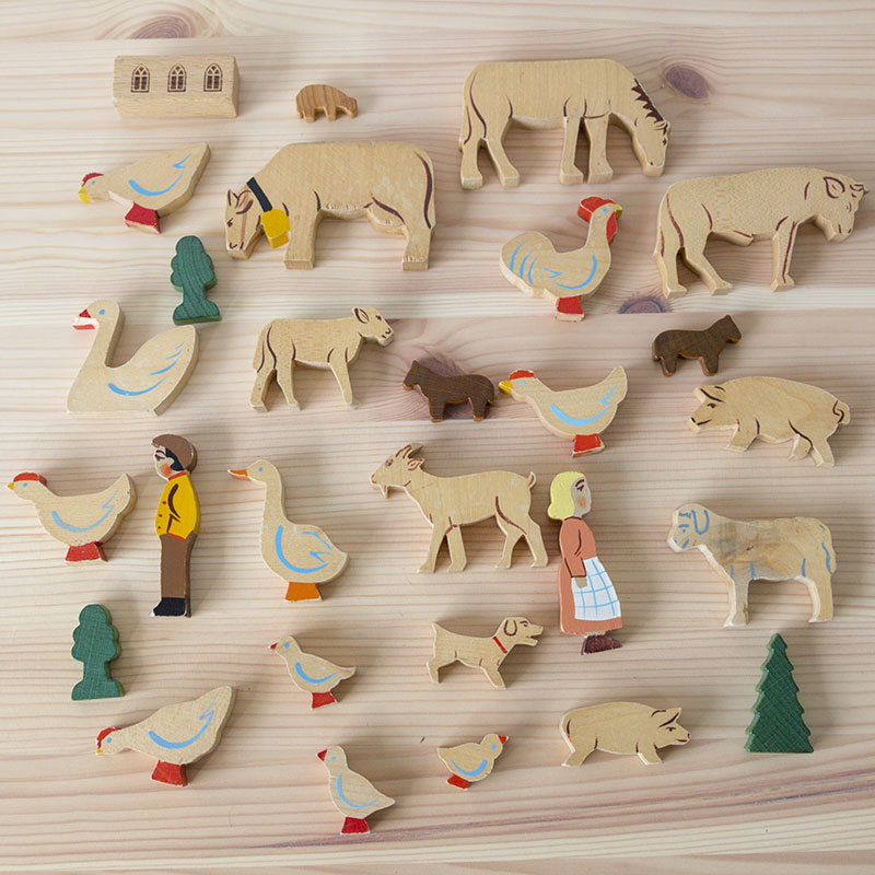 Figurine animaux et fermiers en bois, datant des années 1960-70.
