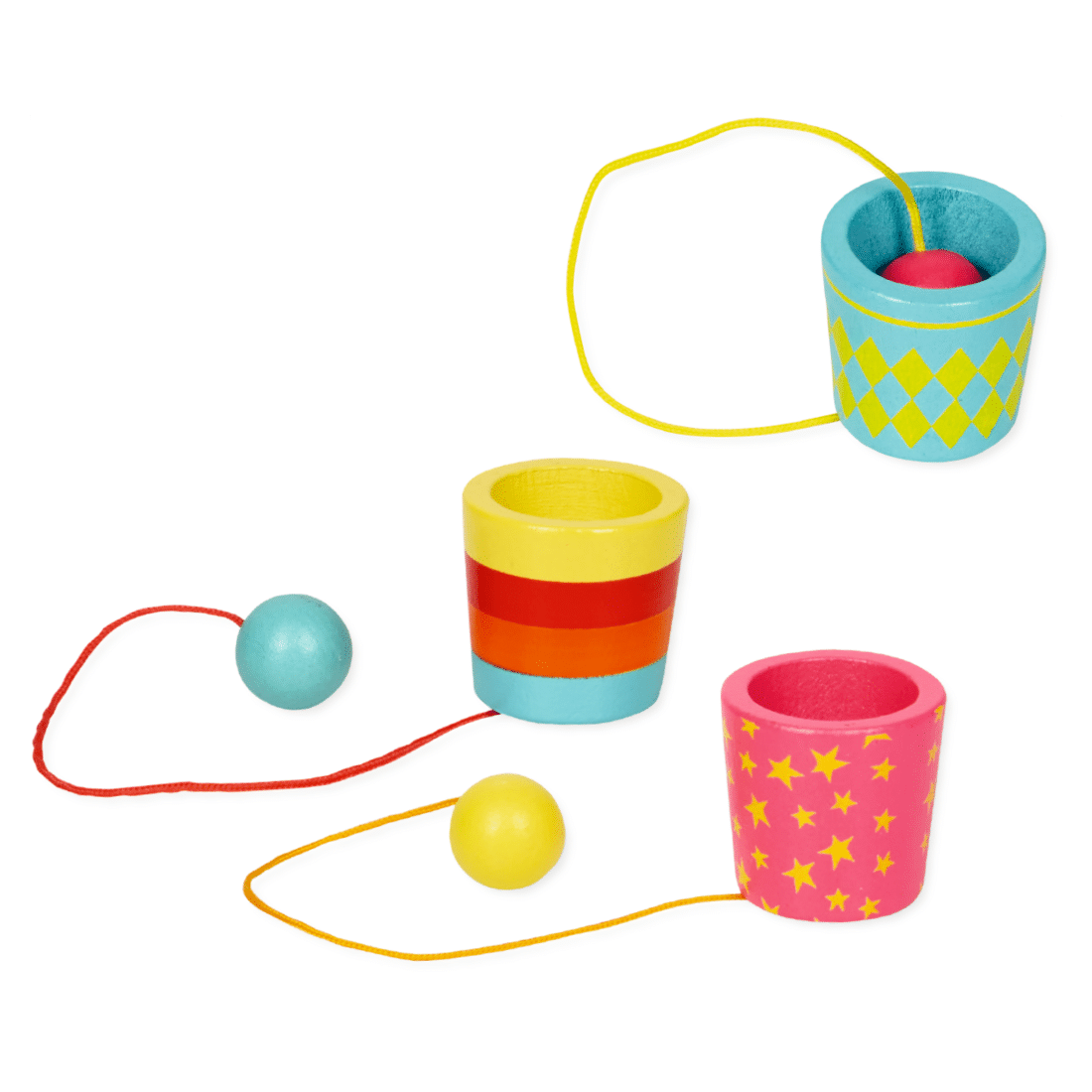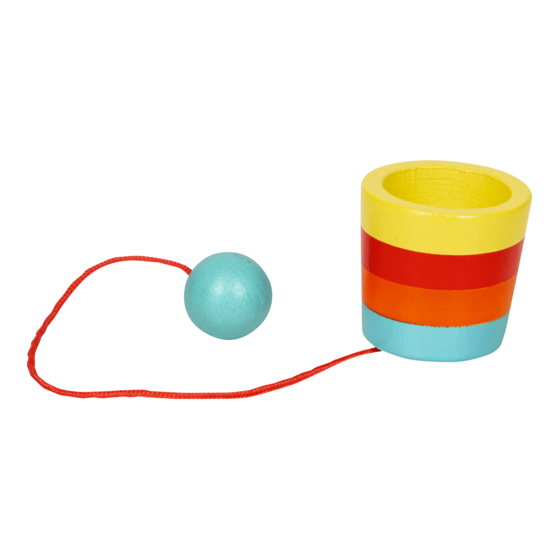 Bilboquet en bois. Les très jeunes enfants tiendront facilement le gobelet dans leurs petites mains et la boule ne risque pas de leur faire mal, s’il rate leur coup !!!