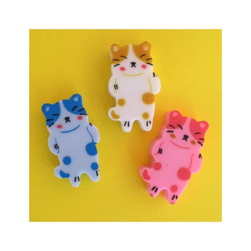 Paquet de 3 gommes en forme de chat. Rose, blanc ou bleu. Une petite fantaisie à glisser dans la trousse des écoliers.