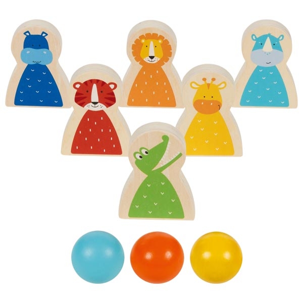 Le coffret comprend six quilles rigolotes en forme d’animaux sauvages et trois boules en bois massif pour multiplier les lancers.