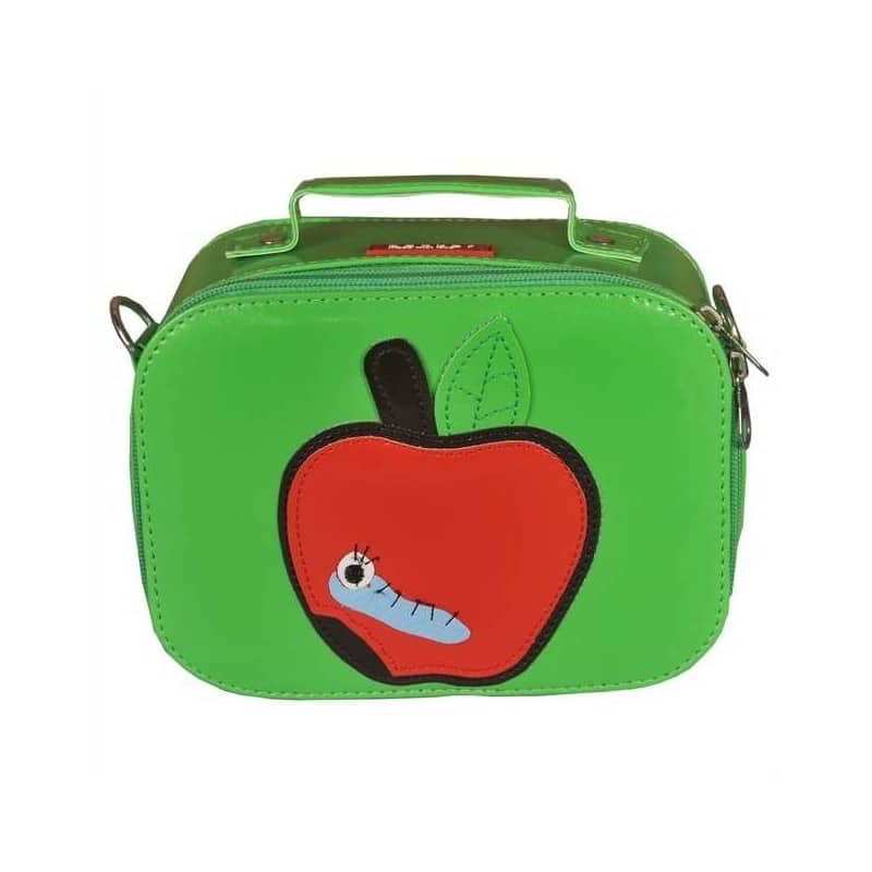 La petite valise verte qui servira de boîte à trésor, ou de lunch box. Une création Bakker pour les enfants. Lunch box pour les goûters du centre de loisirs, les sorties scolaires… à moins qu’elle ne serve à ranger des petites choses.Valise en vinyle vert décorée d’une pomme.