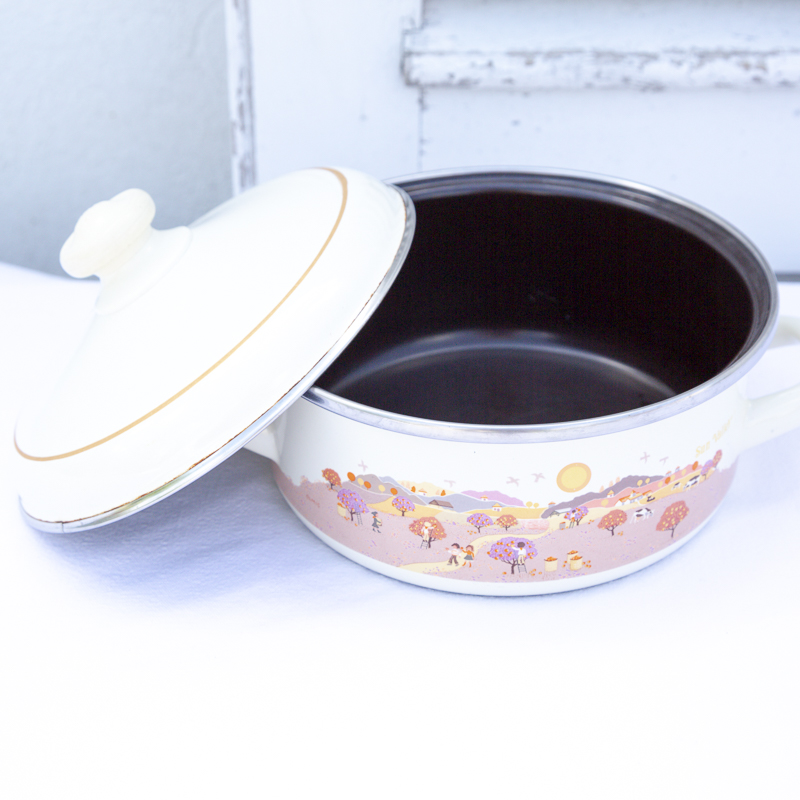 Marmite, chaudron en émail avec un motif naïf, une scène de plein air aux très belles couleurs pastels.