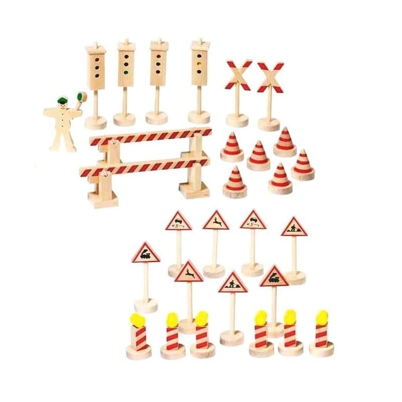 Vingt neuf éléments en bois pour rendre les courses de voitures encore plus interessantes. Feux réglables et panneaux de signalisation pour jouer aux petites voitures.