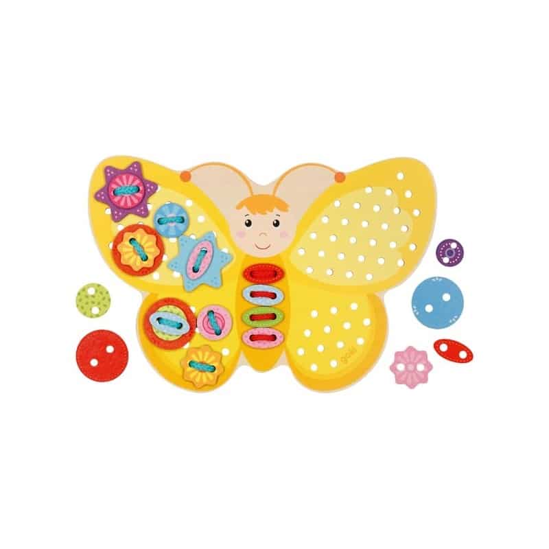 Un jeu de laçage avec 50 pièces et 4 lacets colorés. Avec ce papillon votre enfant va placer les pièces dans le sens et l’ordre qu’il souhaite et développera sa motricité fine et son imagination.