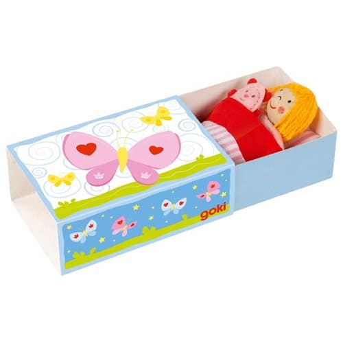 Petite boîte en carton qui coulisse pour y installer confortablement la petite poupée sur son oreiller. Une fois couchée avec son doudou on ajoute la petite couverture rayée rose et blanc.