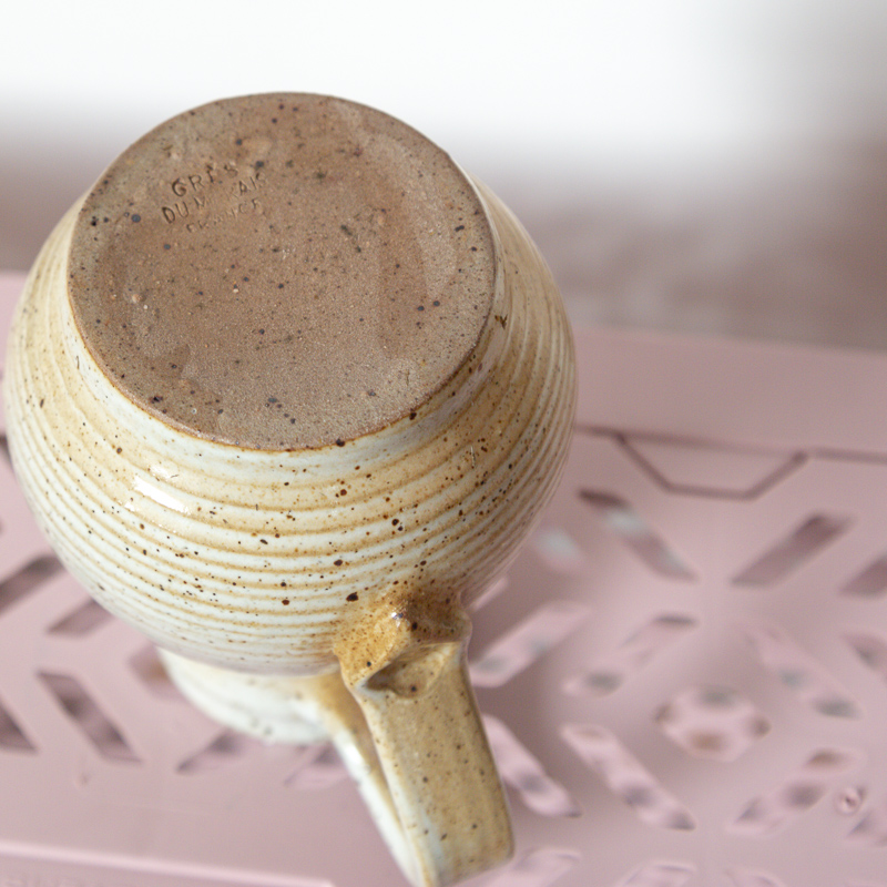 Pichet en grès provenant de la fabrique grès du marais, avec son anse, vintage. La couleur est très élégante. Il est en parfait état.