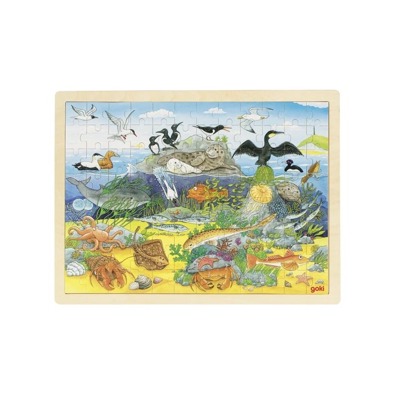Puzzle sur plaque en bois avec les animaux qui vivent sur ou sous l’eau. On s’amuse et on découvre les animaux dans leur habitat.