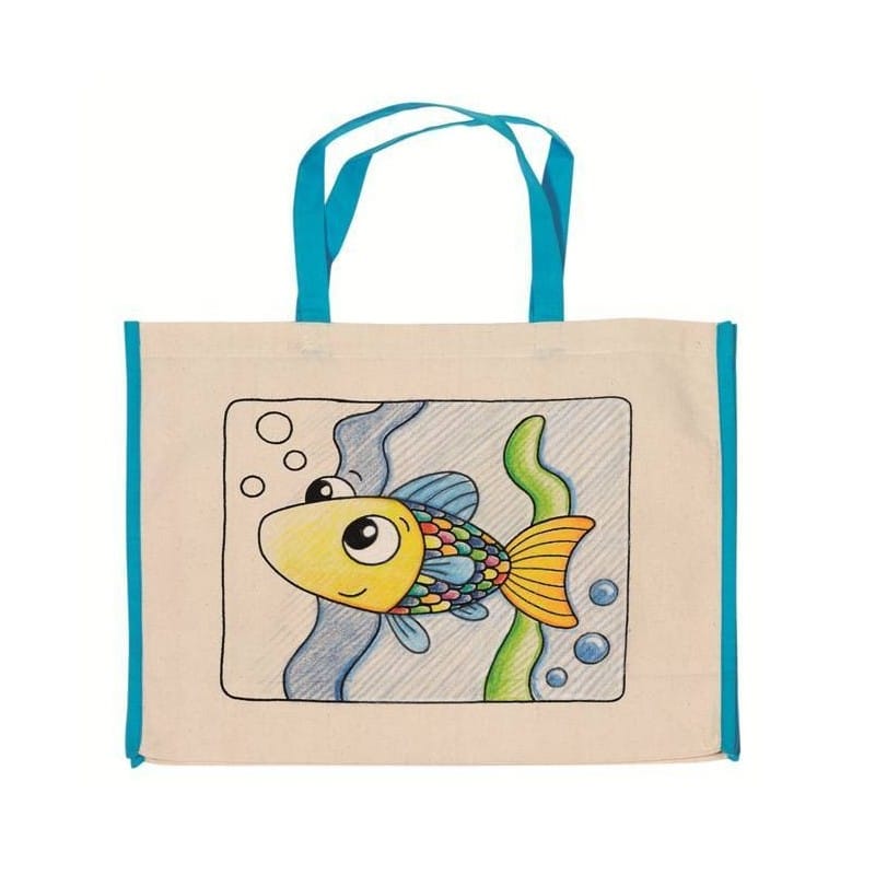 Sur le devant un beau poisson imprimé et sur le derrière une frise de petits poissons. Un grand sac en coton qui ne demande plus qu’à être colorié avec des crayons pour textile. Ce sac a un large soufflet ce qui permet de le prendre pour aller à la plage et y mettre serviette, palmes…