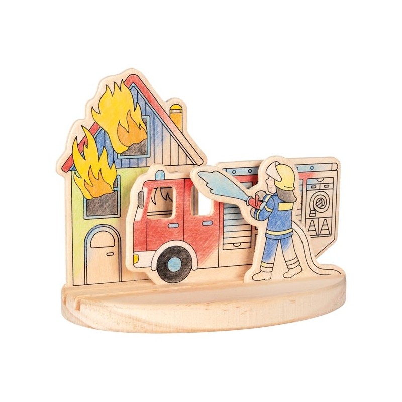 Décor sur le thème des pompiers. Une fois tous les éléments décorés on les installe sur le socle en bois.