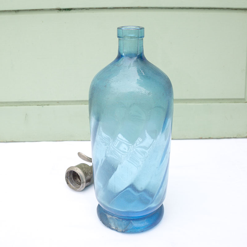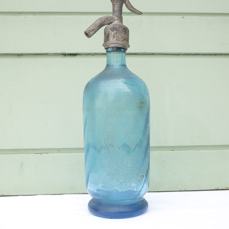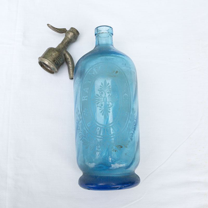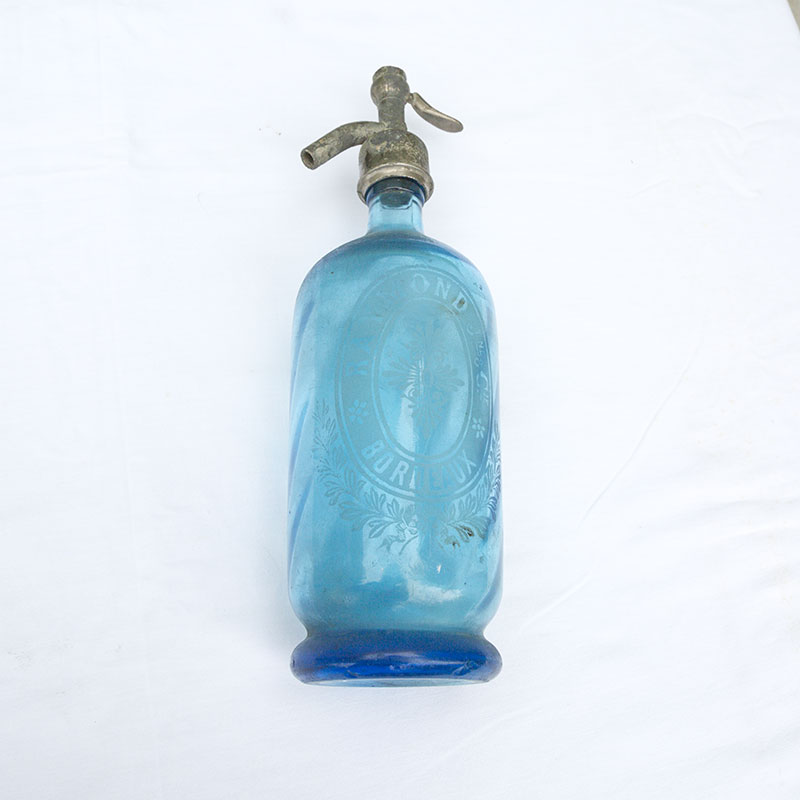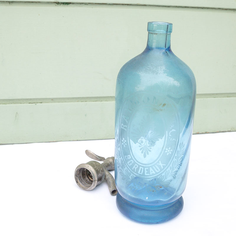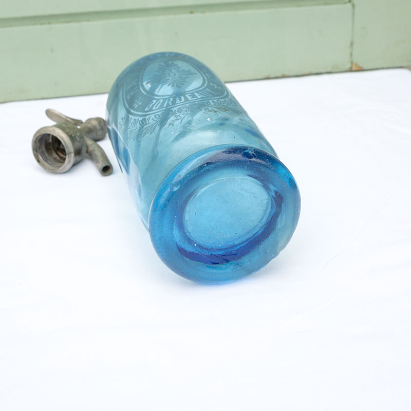 Siphon ancien en verre bleu marqué « Raymond Bordeaux » sur la bouteille avec un joli médaillon un décor végétal . Embout en métal de belle forme, étain sans plomb SMA gravé » Les Couronnes ».