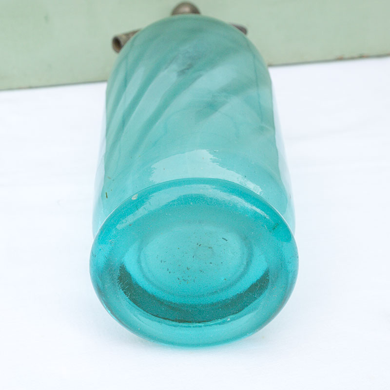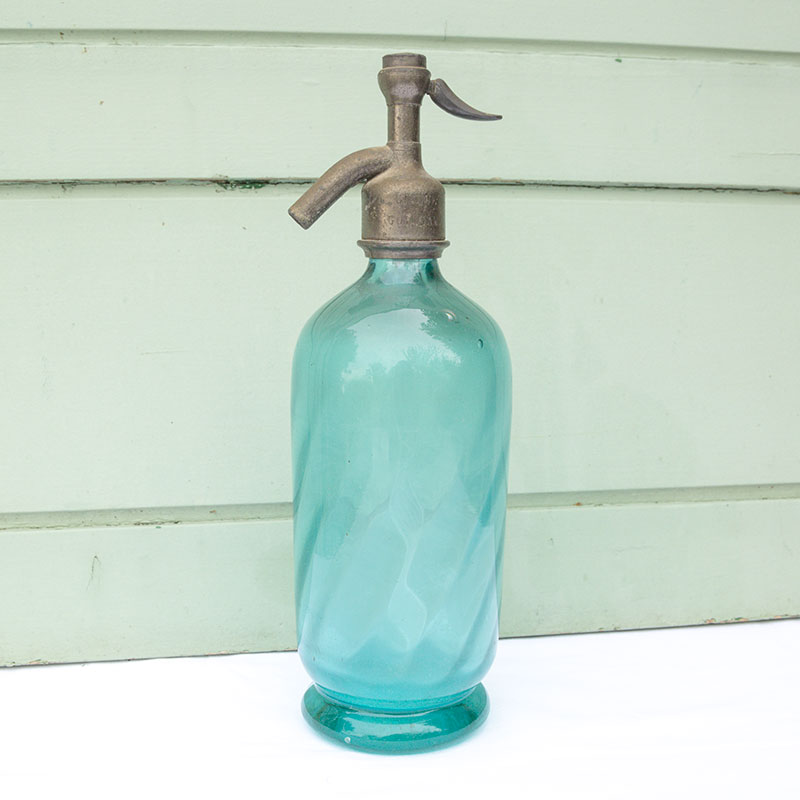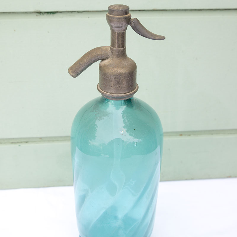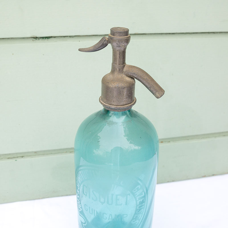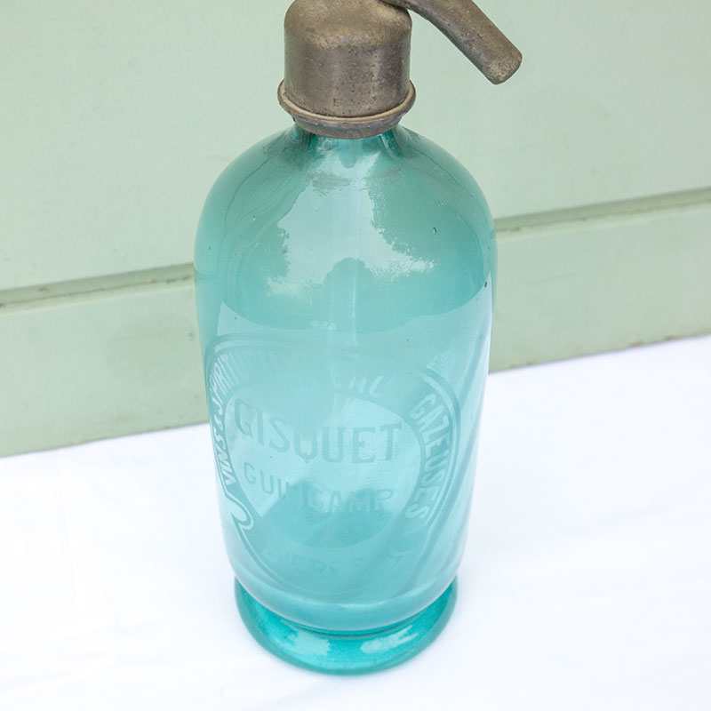 Très joli siphon en verre bleu et métal gravés « Vins et spiritueux. Eaux Gazeuses. Bières Gisquet Guimganp.