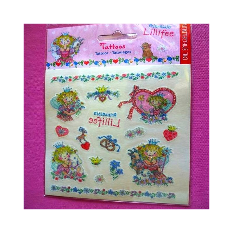 Planche de quatre grands tatouages avec Lilifée qui ceuillent des fleurs, avec son agneau, dans un coeur, ou avec sa baguette magique, et des petits tatouages coeurs, fleurs…