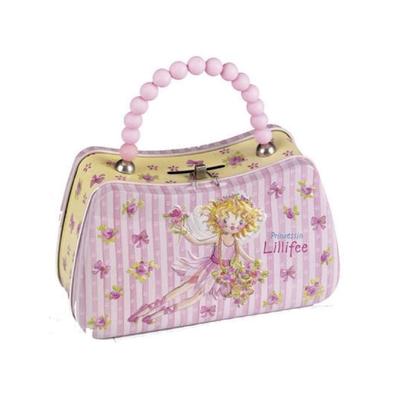 Tirelire Lilifée en forme de sac à main. Une idée cadeau enfant pour un l’anniversaire d’une petite fille. Tirelire en métal avec motifs en relief. Une anse pour s’en servir également de sac à main, et bien entendu un cadenas avec clef. Une belle tirelire princesse qui servira également de décoration.
