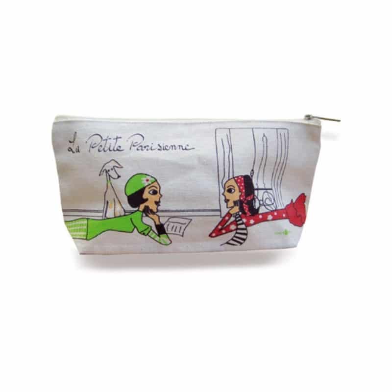 Pour l’école, ou pour le maquillage trousse en coton bio et encres biologiques, avec fermeture éclair. Une pochette lavable en machine. Trousse de la collection La Petite Parisienne, modèle « Meilleures copines » de la marque Zazazou.