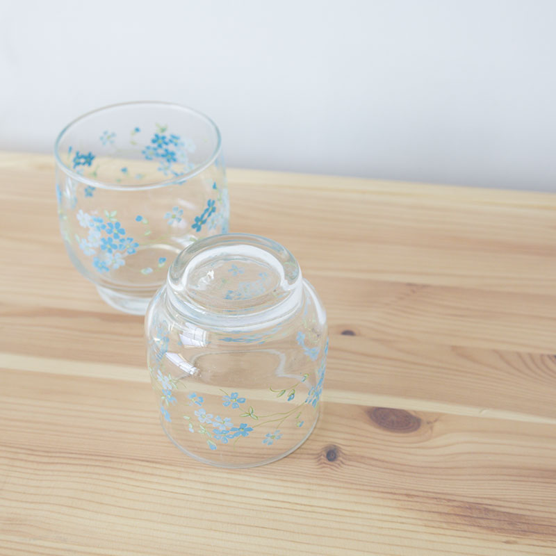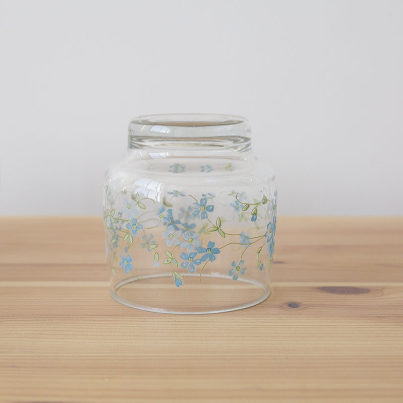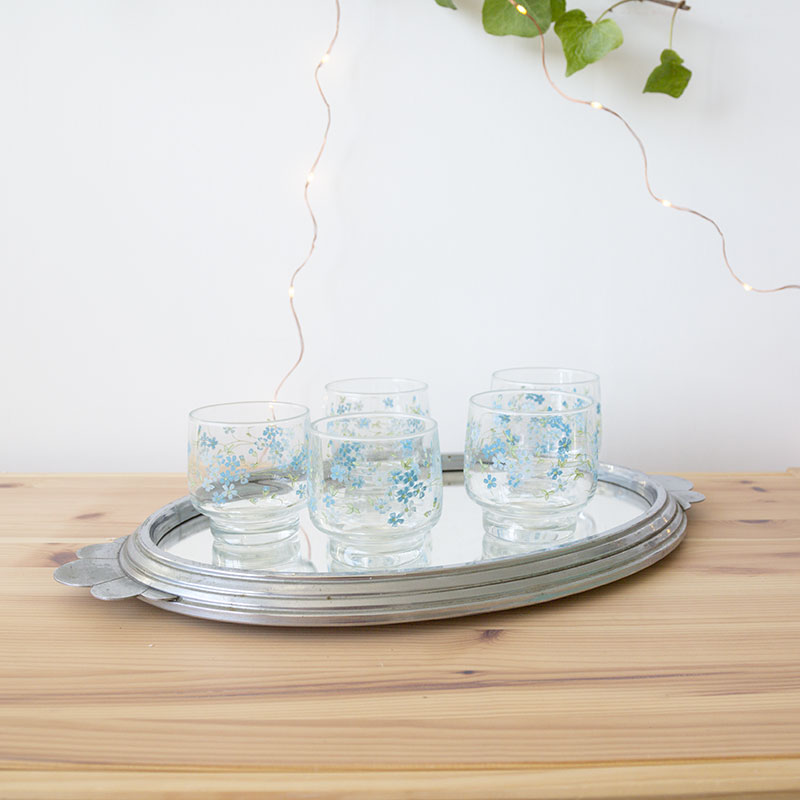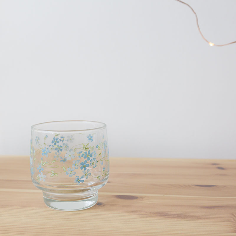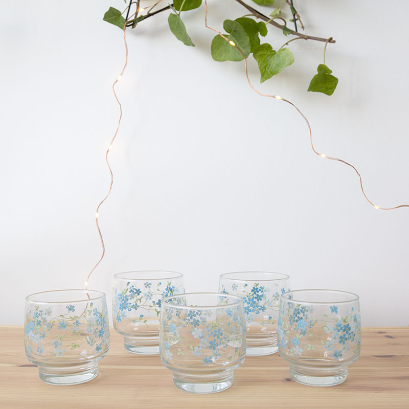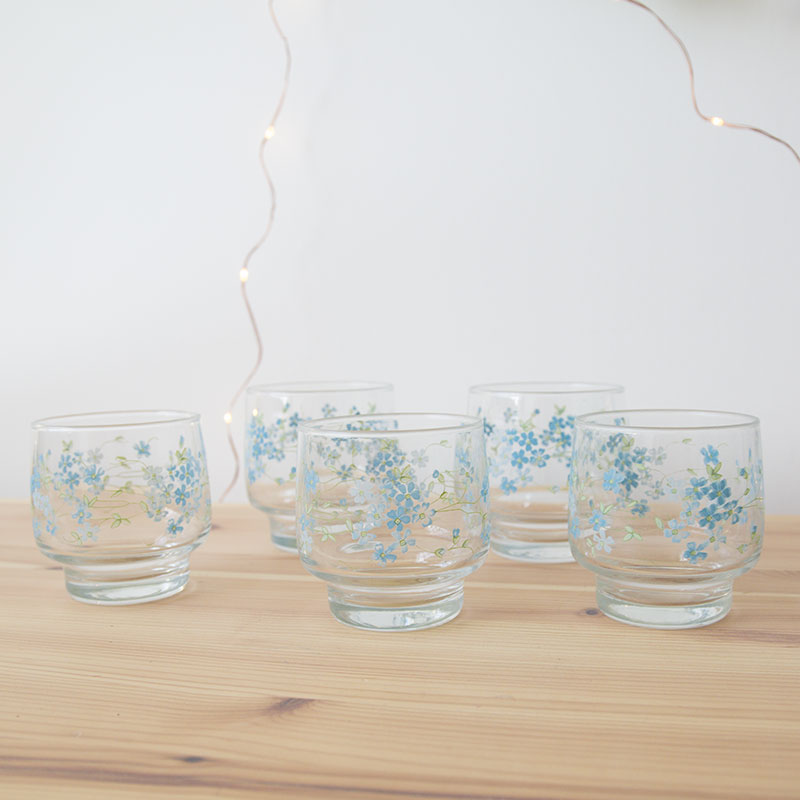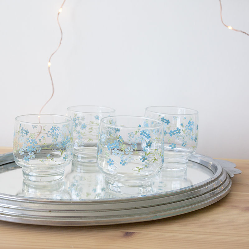 4 verres à eau Arcopal transparents à décor de fleurs bleues et blanches, des myosotis. Il s’agit du modèle Veronica de la marque Luminarc.